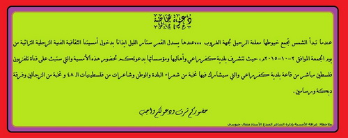 دعوة لحضور امسية شعريةتتشرف بلدية كفرراعي ومؤسساتها بدعوتكم لحضور الامسية الشعرية والتي ستبث على قناة فلسطين مباشر من قاعة بلدية كفرراعي مساء يوم الجمعة 2/10/2015.